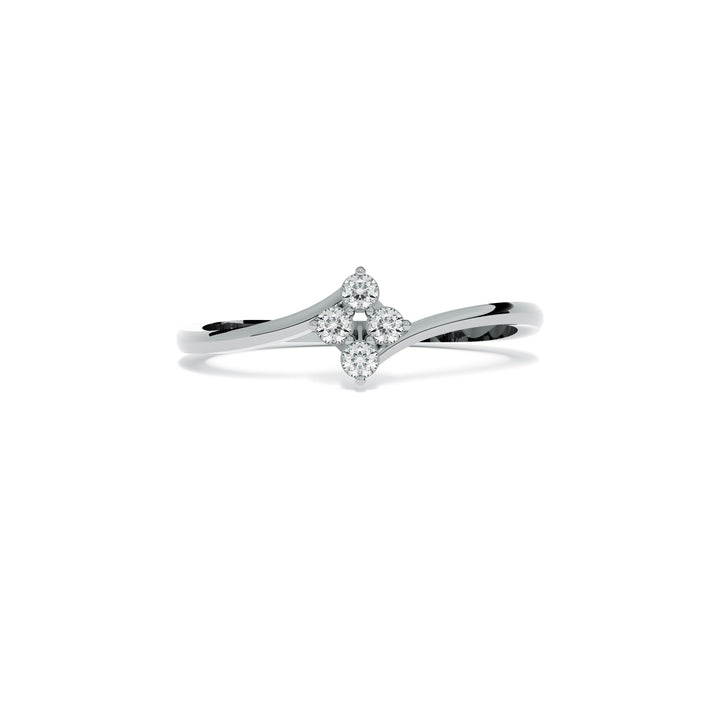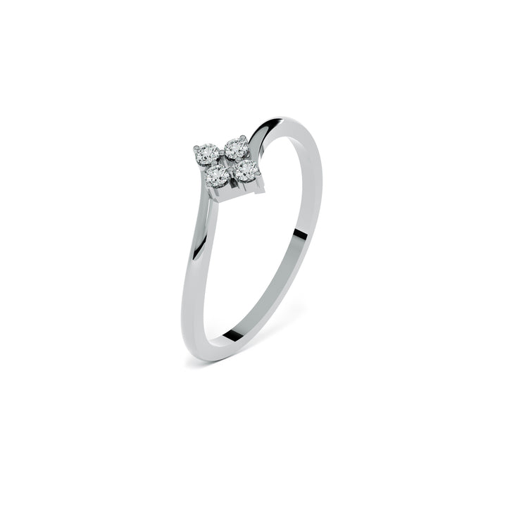 A modern take on floral elegance, this ring features four radiant round-cut diamonds arranged in a symmetrical cluster atop a sleek, gently curved band. The elevated setting enhances the diamonds' brilliance, creating a striking yet delicate silhouette. Perfect for those seeking contemporary charm with a touch of classic sparkle, ideal for everyday elegance or special moments.