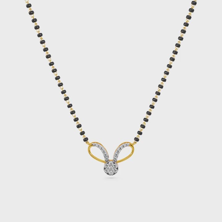 A modern mangalsutra pendant crafted in a fluid twin-loop silhouette, symbolising unity and love. Adorned with shimmering stones and finished in a radiant gold tone, this eye-catching design offers understated elegance with a contemporary twist.