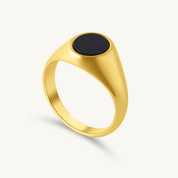 Make your mark. Crafted from stainless steel and finished in rich 18k gold tone, our Black Oval Signet Ring defines quiet power. The deep onyx tone reflects strength and individuality. Waterproof, anti-tarnish, and designed especially for you, for your bold moments of confidence and timeless style.
