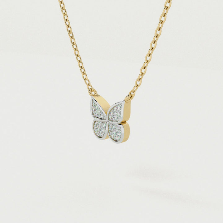 Inspired by nature’s delicate beauty, this necklace features butterfly wings adorned with shimmering lab-grown diamonds. The graceful design embodies freedom, transformation, and elegance, making it a captivating choice for nature lovers and fashion enthusiasts alike. Perfect for celebrations or adding a touch of whimsy and sparkle to any outfit, day or night.