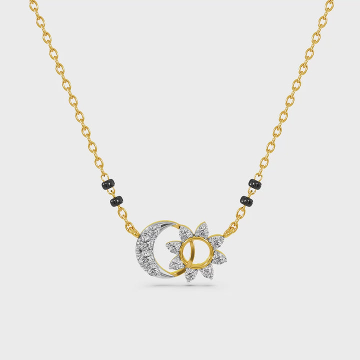 A captivating mangalsutra inspired by the harmony of the sun and moon. Designed with intricate polki-style stone detailing and a warm gold-toned finish, this unique motif symbolises balance and eternal togetherness. A perfect blend of artistry and meaning, ideal for women who love statement designs with depth.