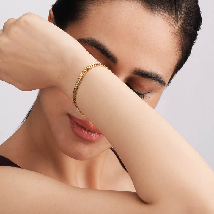 Match this flat link bracelet with formal blazers for a sleek finish, or layer it with slim bangles for a jewellery-styled modern stacked look.