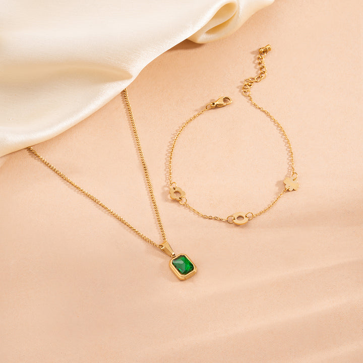 Classic Emerald Necklace & Dainty Flower Bracelet Combo Set
