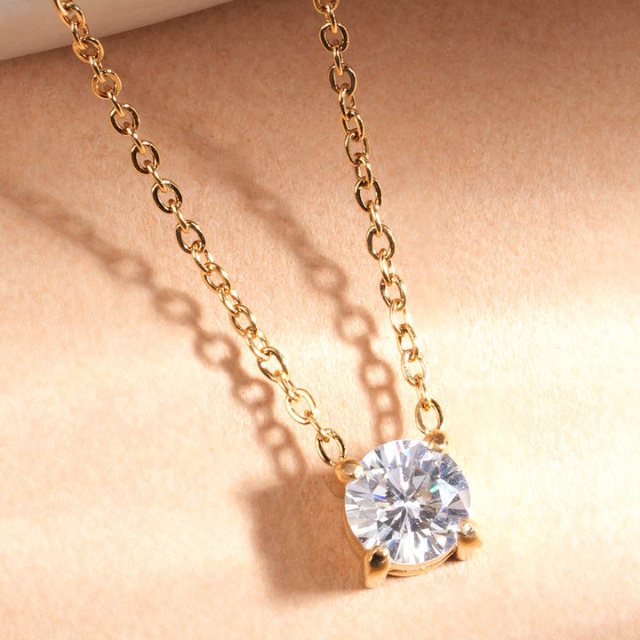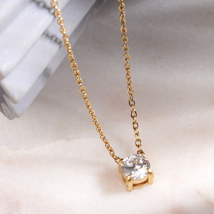 Embrace timeless elegance with the Classic Solitaire Glow Pendant Necklace, featuring a radiant white cubic zirconia set in 18K gold-plated stainless steel. Its minimalist yet striking design adds a subtle sparkle to any outfit, making it perfect for everyday wear or special occasions. This pendant balances sophistication and versatility, serving as a refined jewellery staple that complements both modern and classic wardrobes.