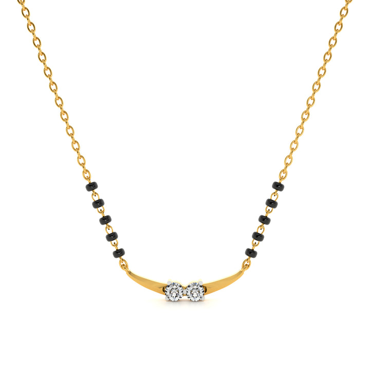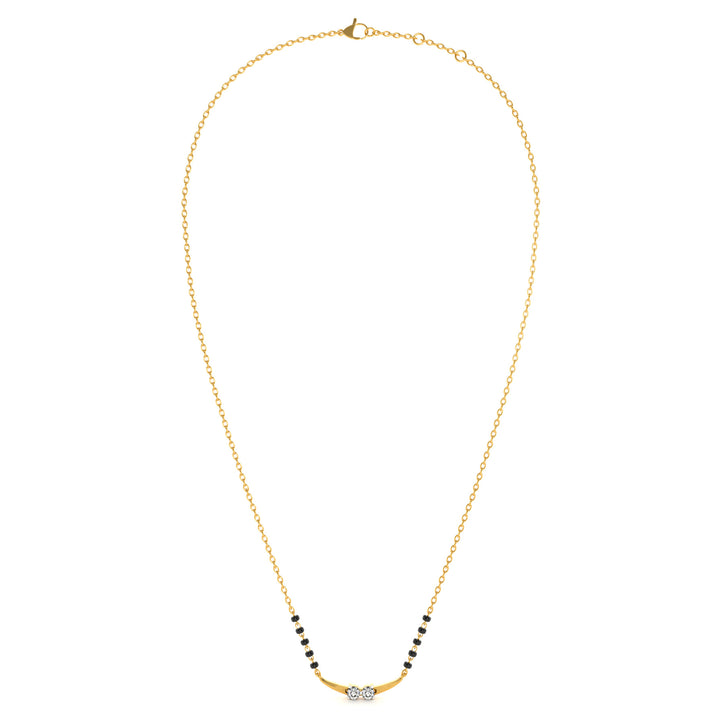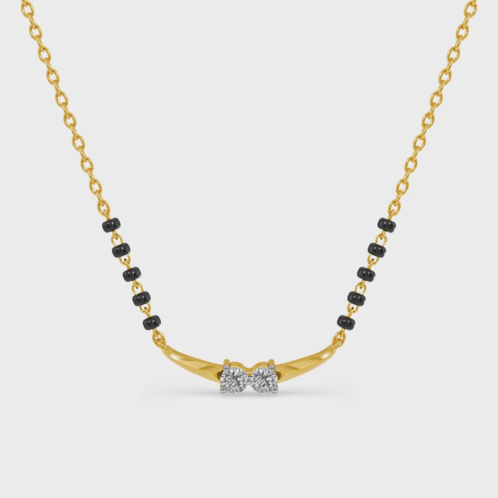 The Couplet Charm Arc Lab Grown Diamond Mangalsutra showcases an elegant arc pendant adorned with dual diamonds, representing partnership, balance, and togetherness. The curved design symbolizes continuity and flow in relationships, while the radiant lab grown diamonds add luminous charm. Crafted with artistry, this piece merges tradition with contemporary appeal, making it a perfect representation of shared journeys, love, and unity that endures forever.