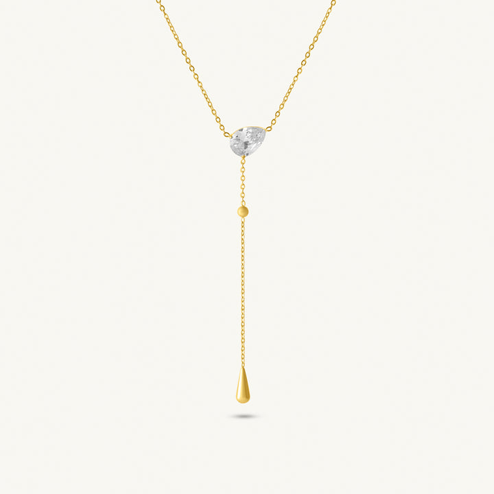 The Crystal Trail Drop Necklace is defined by a slender chain that flows into a vertical drop, finished with a sparkling crystal accent. Representing clarity and direction, the design reflects refinement through minimal details. The polished golden finish enhances the brilliance of the crystal, creating a captivating focal point. Crafted with precision for durability and elegance, this necklace carries symbolic meaning while maintaining a timeless appeal, making it a refined piece of jewellery with lasting significance.