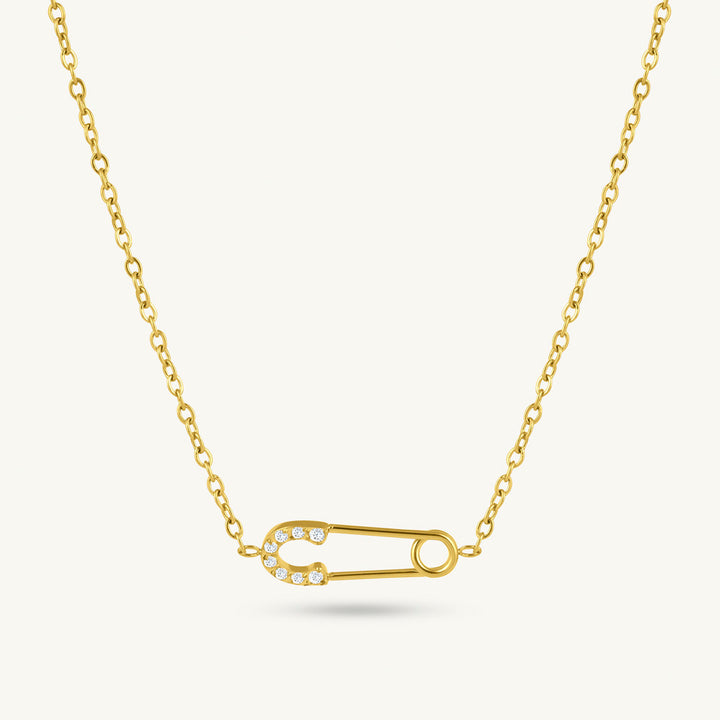 This necklace features a playful safety pin charm with crystal accents, hanging from a fine gold-toned chain. A fun, offbeat accessory with a polished finish, it’s designed to be waterproof and anti-tarnish for lasting wear.