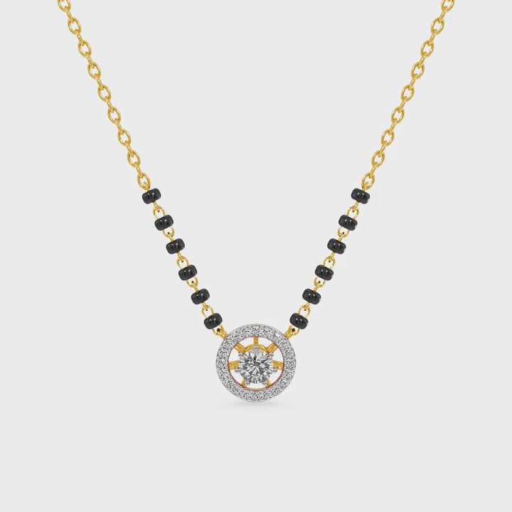 The Dazzle Glow Round Lab Grown Diamond Mangalsutra showcases a bold circular pendant encased with shimmering diamonds that radiate brilliance. The round motif symbolizes completeness, eternity, and unity, while the finely crafted setting ensures maximum sparkle. Every diamond is meticulously placed to create a halo effect that glows with elegance. A perfect combination of heritage and contemporary artistry, this mangalsutra represents enduring love and the beauty of lifelong commitment.