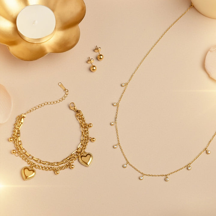 - Jewellery: Plain Ball Stud Earrings + Multiple Stones Necklace + Hearts All Over Bracelet