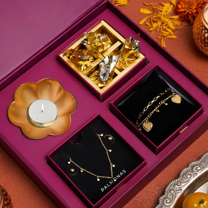 Make gifting effortless this Diwali with the Palmonas Gift Hamper. Designed for the modern woman, it includes a delicate heart bracelet, stylish stud earrings, with an elegant pendant for women, and premium chocolates. Whether for family, friends, or colleagues, this gift hamper adds a personal touch to every celebration, thoughtful, graceful, and perfect for the festive season.