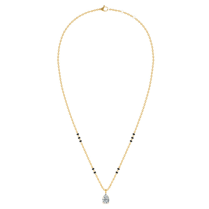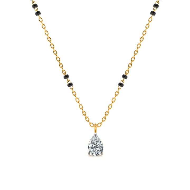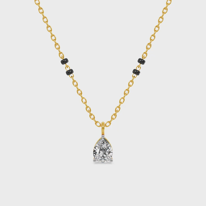 The Dewlight Drop Lab Grown Diamond Mangalsutra radiates purity and elegance with its teardrop-shaped pendant accented by shimmering diamonds. The drop design symbolizes clarity, renewal, and devotion, while the glowing lab grown diamonds add brilliance and depth. Crafted with expert detail, this pendant sparkles with refined beauty, merging traditional symbolism with modern artistry. A graceful emblem of love, it shines as a timeless tribute to sacred marital bonds.