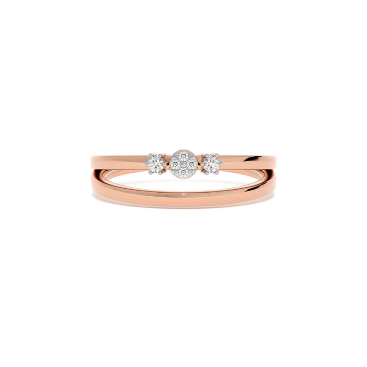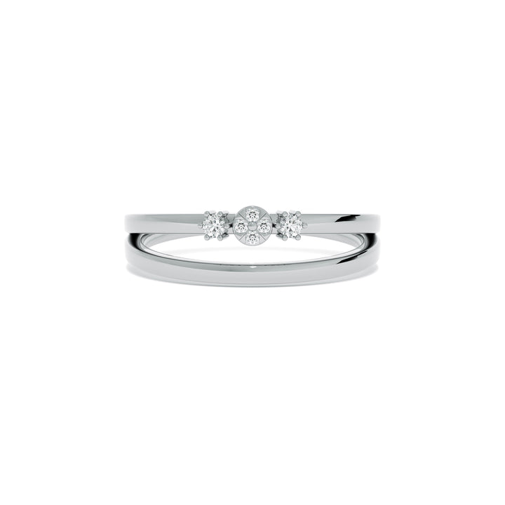 A minimal yet striking ring featuring a sleek double band design topped with three brilliant diamonds, symbolizing past, present, and future. Its refined silhouette adds a touch of sophistication, making it an ideal choice for promise rings, engagement jewelry, or everyday elegance. Perfect for those who love timeless finger rings with modern detailing and radiant sparkle.