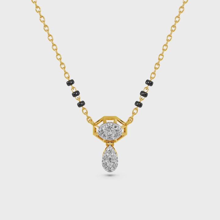 A bold mangalsutra pendant featuring a hexagonal stone-studded motif paired with a graceful dangling drop. Finished in a radiant gold tone and accented with classic black beads, this design offers a striking balance of modern geometry and traditional elegance.