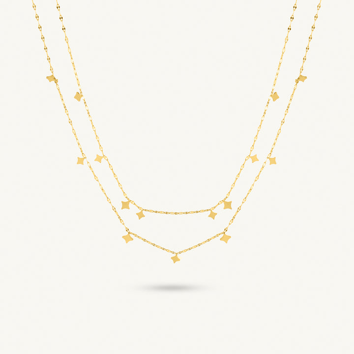 You were born to shine. Crafted from stainless steel and plated in a radiant 18K gold tone, the Eclipse Tiered Star Necklace captures celestial elegance with a modern twist. From us to you, it’s made to light up your every moment. Layer it for a luminous, evening-ready allure.