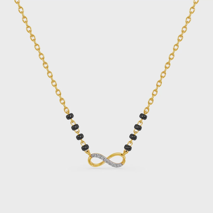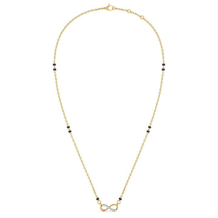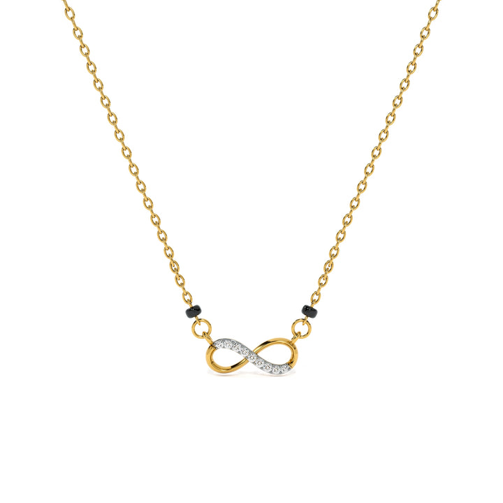 The Endless Love Infinity Lab Grown Diamond Mangalsutra is designed with the iconic infinity motif, representing eternal connection and everlasting devotion. Embedded with sparkling lab grown diamonds, the pendant radiates brilliance and symbolism in equal measure. Its flowing design captures the essence of continuity, making it a modern yet deeply meaningful expression of marital vows. Crafted to perfection, this mangalsutra reflects timeless beauty, celebrating love that knows no bounds.