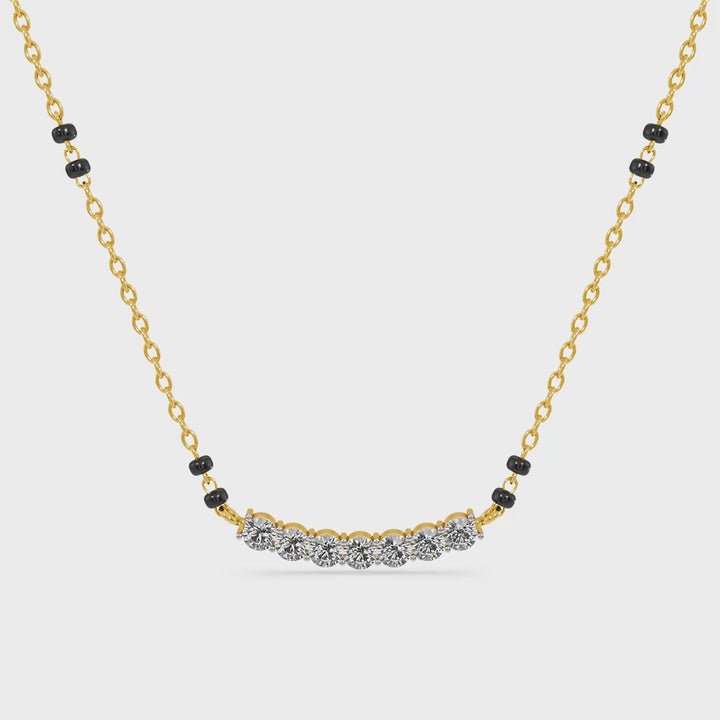 The Eternal Curve Glow Lab Grown Diamond Mangalsutra features a delicately arched design set with shimmering diamonds that radiate elegance. The curved motif reflects balance, harmony, and the flow of love, symbolizing the strength of marital unity. Each diamond is precisely set to capture brilliance and sparkle with every movement. A refined creation, this mangalsutra blends minimalism with symbolism, making it a luminous tribute to everlasting devotion.