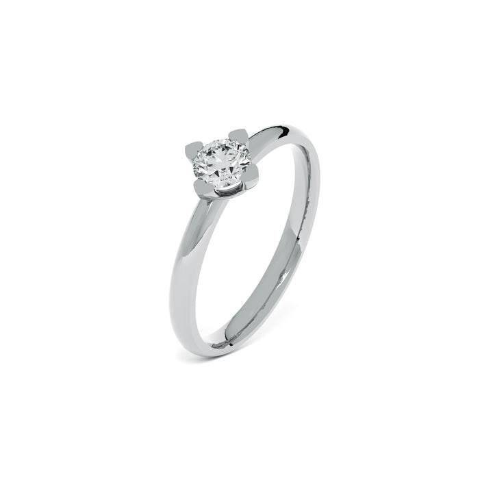 Showcasing a striking round-cut center diamond secured by a distinctive four-prong crown setting, this ring combines modern elegance with architectural precision. The sleek band emphasizes the gemstone’s brilliance, making it an ideal choice for engagements or special occasions. A bold yet timeless design that highlights craftsmanship and sparkling sophistication.