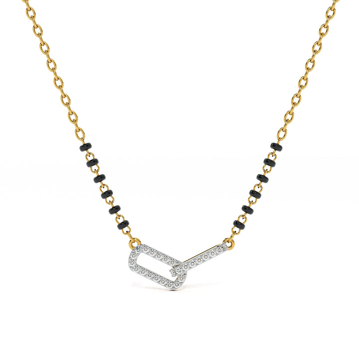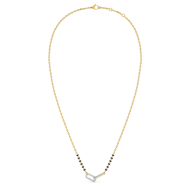 The Eternal Interlocked Frame Lab Grown Diamond Mangalsutra symbolizes unbreakable connection with its unique dual-frame design. Interwoven links represent harmony, unity, and strength, while shimmering lab grown diamonds add brilliance and depth. Crafted with precision, this piece blends tradition with a bold, modern style. The interlocked motif is a timeless reminder of everlasting love, making it a meaningful expression of devotion and elegance, perfect for honoring the sacred marital bond.