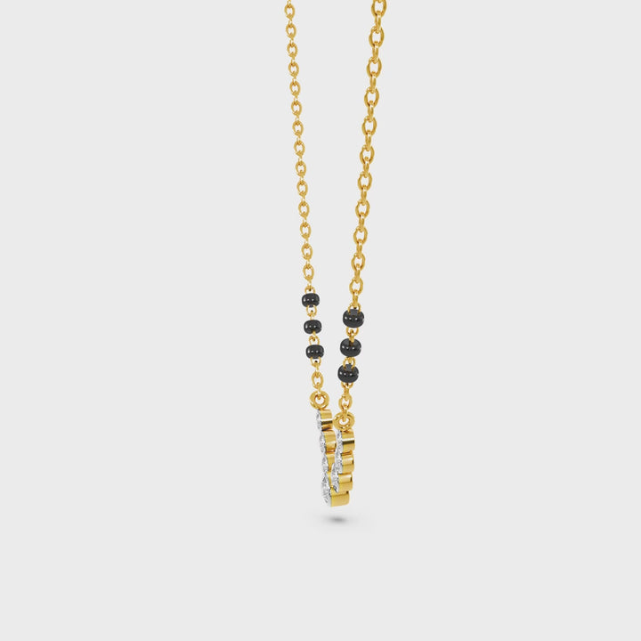 A graceful mangalsutra featuring a curved row of sparkling polki-style stones framed in warm gold. Finished with classic black beads, this elegant design adds effortless shine to everyday looks.