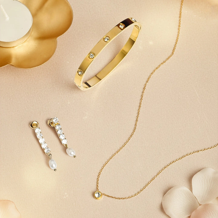 Celebrate the joy of Diwali with the Palmonas Diwali Gift Hamper, thoughtfully curated to make every moment memorable. This festive hamper includes a graceful bangle bracelet for women, chic dangler earrings, a timeless pendant necklace for women, and a selection of premium chocolates. A perfect blend of elegance and warmth, it’s a Diwali gift hamper made to express love, appreciation, and festive cheer.
