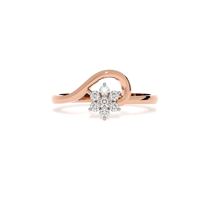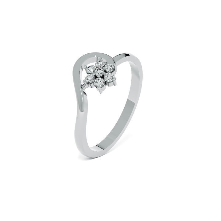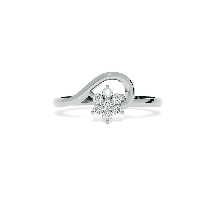Whimsical and radiant, this ring captures the essence of blooming elegance with its cluster of shimmering diamonds arranged like petals in full bloom. The flowing band embraces the floral centerpiece, evoking nature’s delicate dance of light and form. Perfect for those who seek a poetic symbol of love, this design blends artistry and brilliance in a truly captivating way.