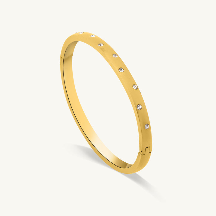 This sleek bracelet is designed with a row of evenly placed crystals that deliver subtle sparkle with refined grace. Its slim silhouette ensures comfort while its timeless design adds versatility, making it ideal for both casual and formal occasions. The bracelet’s understated brilliance makes it a must-have piece for jewellery lovers seeking everyday glamour.