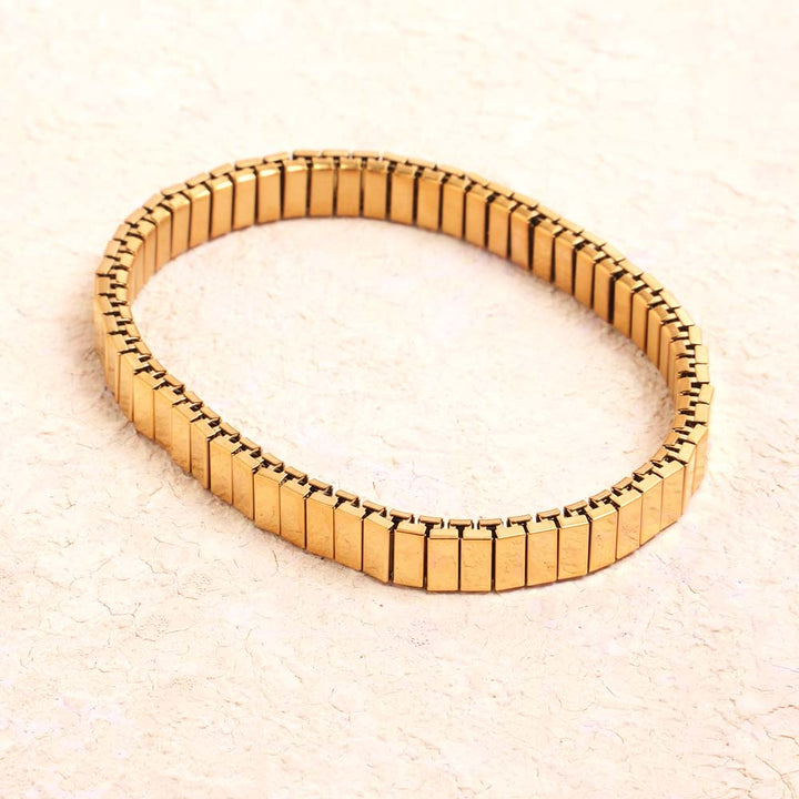 The Golden Flex bracelet offers effortless style with its adjustable, stretchable design in radiant 18k gold-tone stainless steel. Perfect for layering or wearing solo, it combines comfort with contemporary elegance. Its sleek, versatile look enhances both casual and dressy outfits, making it a must-have statement piece for everyday sophistication and refined glamour.