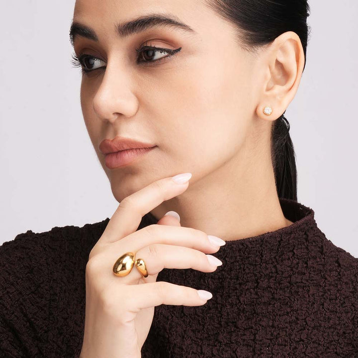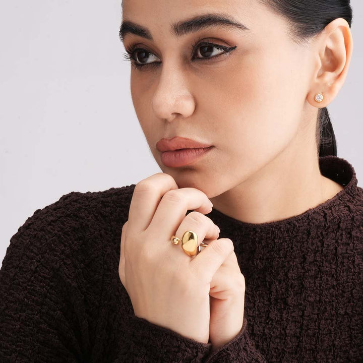 The Golden Teardrop Sculpt Ring captures elegance with its fluid teardrop-inspired design. Crafted in radiant gold tone, this ring is a symbol of modern artistry and timeless charm. The sculptural form makes it an eye-catching piece, adding sophistication and depth to any jewellery collection. Perfectly balancing simplicity with bold design, it reflects refinement and individuality. A must-have accessory for those who seek jewellery that stands out with effortless grace.