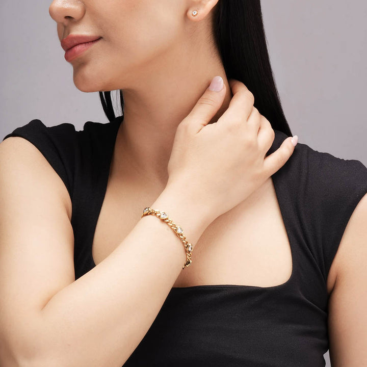The Heart Sparkle Charm Bracelet is a romantic and dazzling piece that celebrates love and elegance. Featuring a chain adorned with a delicate golden heart charm, it is enhanced with sparkling stone accents that shimmer beautifully with every movement. Lightweight and comfortable, this bracelet is perfect for women who love feminine jewellery with a touch of glamour. Ideal for everyday wear, festive occasions, or gifting, it’s a timeless bracelet that combines charm, sparkle, and sophistication in one beautiful design.