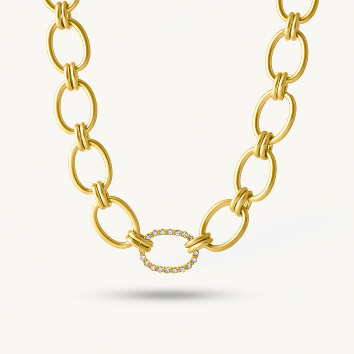 The Heritage Link Bold Necklace is designed with interlinked golden loops, forming a strong and commanding chain that speaks of confidence and power. Each link is carefully crafted to reflect heritage-inspired artistry while maintaining a modern edge. The bold design showcases strength and durability, making it a statement necklace that captures attention. With its polished finish and structured form, this piece balances tradition with contemporary appeal, creating a necklace that reflects both resilience and timeless style.