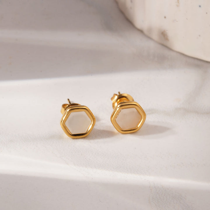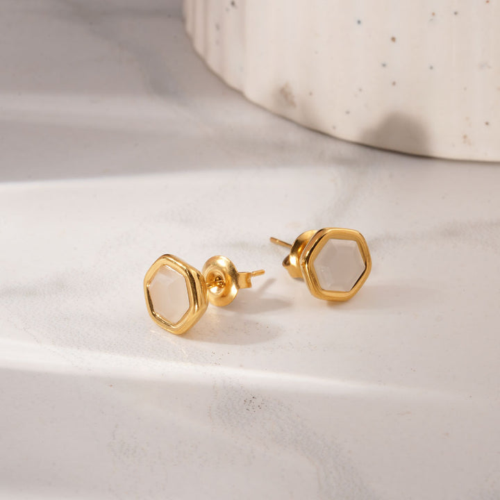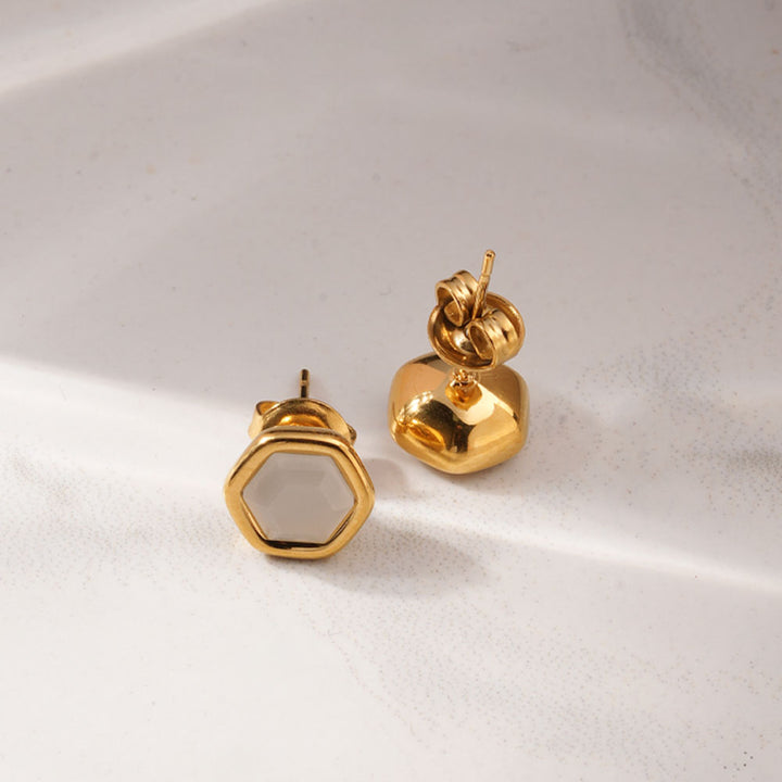 Elevate your basics with these Hexagon Matte Stone Stud Earrings. Featuring a muted stone set in a geometric gold-toned frame, they bring subtle sophistication to everyday wear. Lightweight, waterproof, and anti-tarnish.