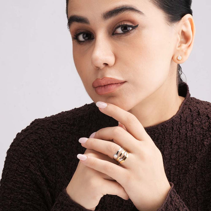 The Horizon Wrap Dual-Tone Ring is designed with sleek layers of silver and gold, symbolizing unity and balance. Its wrap-around form reflects contemporary artistry, creating a bold yet versatile look. This modern ring makes a powerful accessory that complements both minimal and statement styles. A perfect harmony of tones, it adds depth and uniqueness to any jewellery collection. With its timeless design and refined finish, the Horizon Wrap Ring stands out as a jewellery essential.