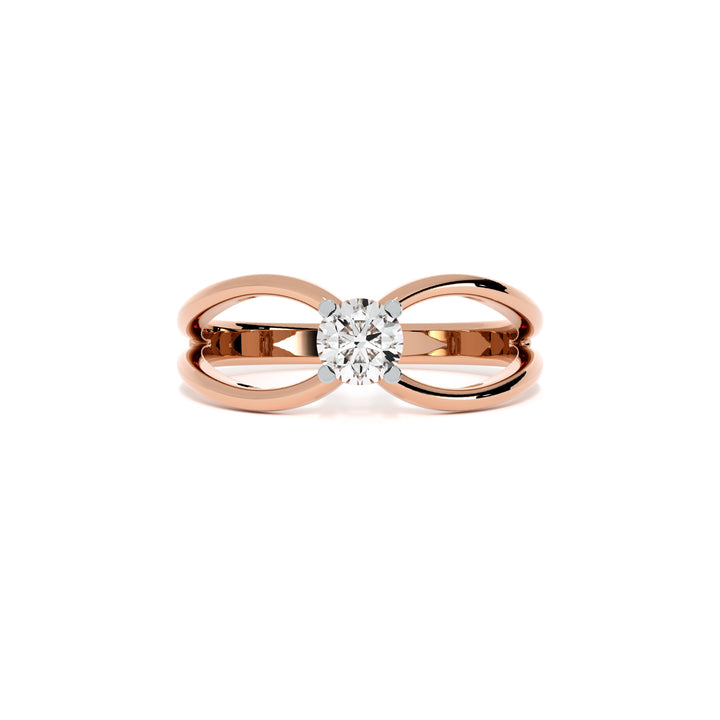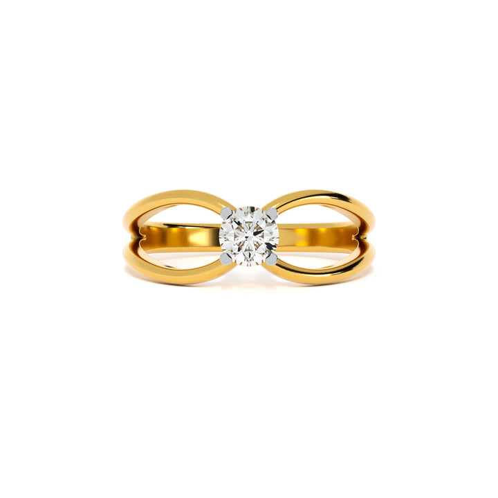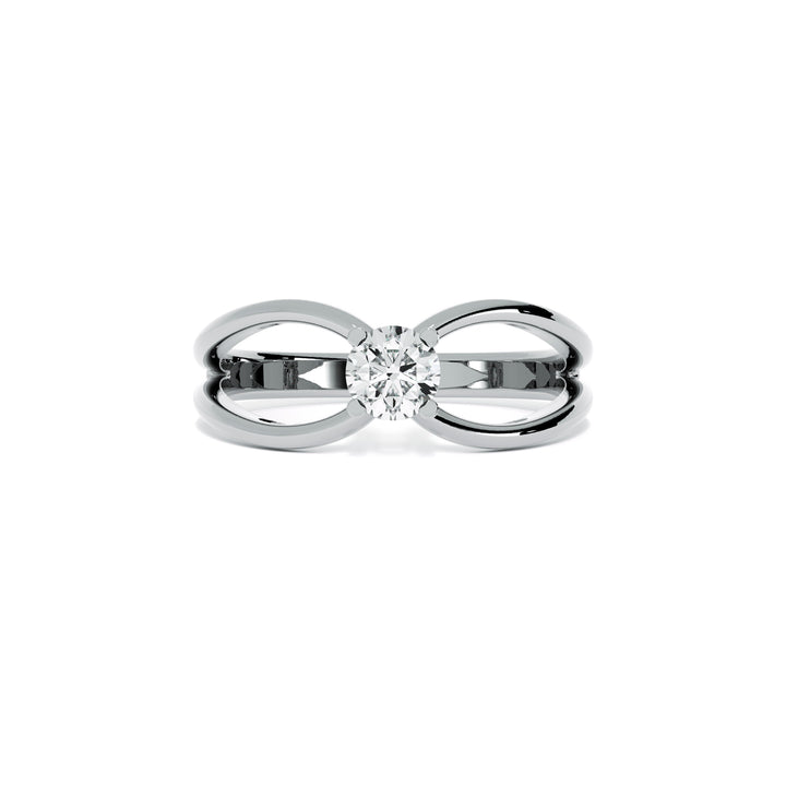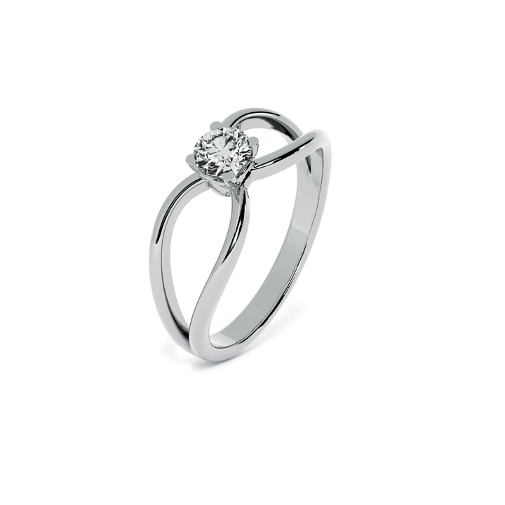 A graceful solitaire ring featuring a fluid split-band design that embraces a dazzling central diamond, symbolizing elegance and modern artistry. The flowing curves add depth and dimension, creating a perfect balance of simplicity and brilliance. Ideal for engagement rings, statement jewelry, or timeless everyday wear, crafted for those who appreciate refined detailing and sparkling beauty.