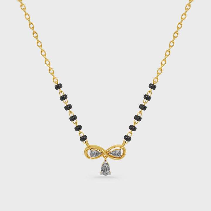 The Infinity Bow Drop Lab Grown Diamond Mangalsutra combines graceful curves with a radiant diamond drop, symbolizing eternal love and devotion. The bow-shaped design represents unity and strength, while the sparkling lab grown diamonds enhance its brilliance. The elegant drop adds movement and light, making the piece both meaningful and visually striking. Crafted with precision, this mangalsutra blends traditional significance with refined artistry, standing as a timeless emblem of marital commitment.