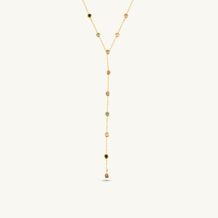 The Joyful Spark Stone Necklace adds a touch of vibrance with its delicate arrangement of colorful stones set along a golden chain. Each gem reflects joy and positivity, creating a lively composition that symbolizes energy and optimism. The golden setting enhances the brightness of the stones, while the balanced arrangement ensures elegance. Crafted with precision, this necklace brings together playfulness and refined beauty, making it a standout piece for those who appreciate jewellery with symbolic meaning and cheerful charm.