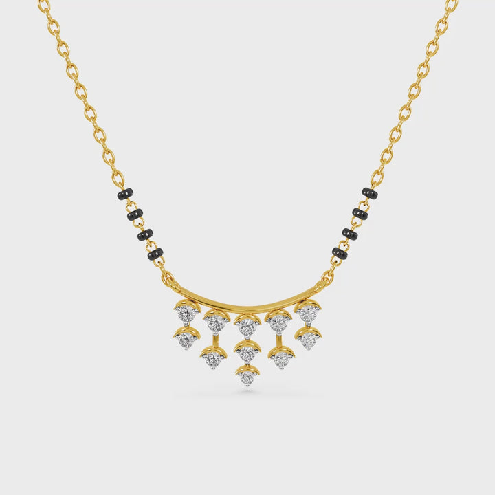 An elegant mangalsutra designed with a gentle curved frame highlighted by hanging polki-style stone drops. The warm gold finish paired with classic black beads creates a refined yet striking look, perfect for women who love delicate statement jewelry.