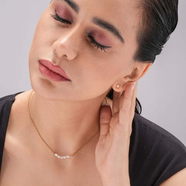 The Minimalist Pearl Bar Necklace offers understated elegance with pearls aligned in a golden bar design. Clean, refined, and versatile, it adds a subtle sparkle to everyday style while maintaining sophistication. Perfect for office wear, casual outings, or layering with other chains, it’s a timeless jewellery staple.