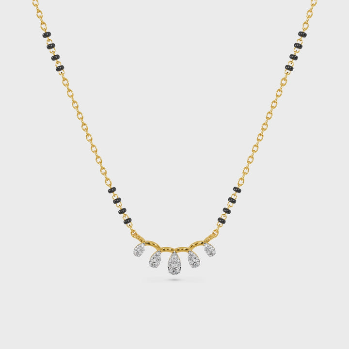 A soft and elegant mangalsutra featuring a flowing curved frame highlighted with dangling polki-style diamond drops. Finished in a radiant gold tone and paired with traditional black beads, this design adds graceful movement and subtle sparkle to any look.