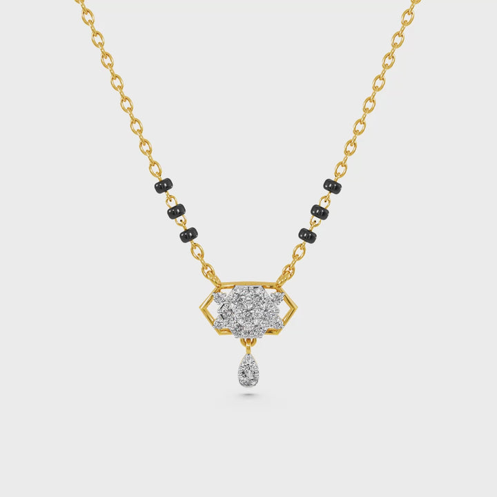 A striking mangalsutra pendant featuring a hexagonal stone-studded motif with a delicate dangling drop. Finished in a warm gold tone, this elegant design adds a bold yet graceful touch to everyday and festive looks.