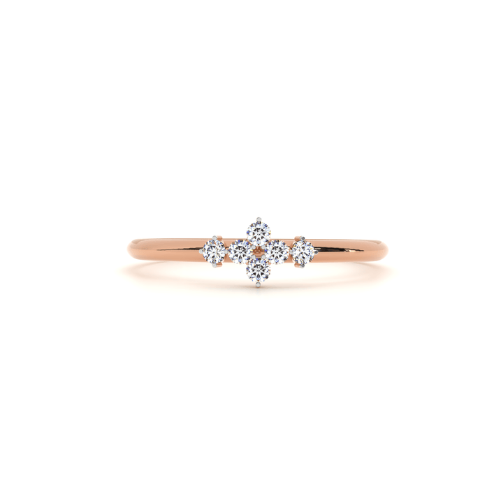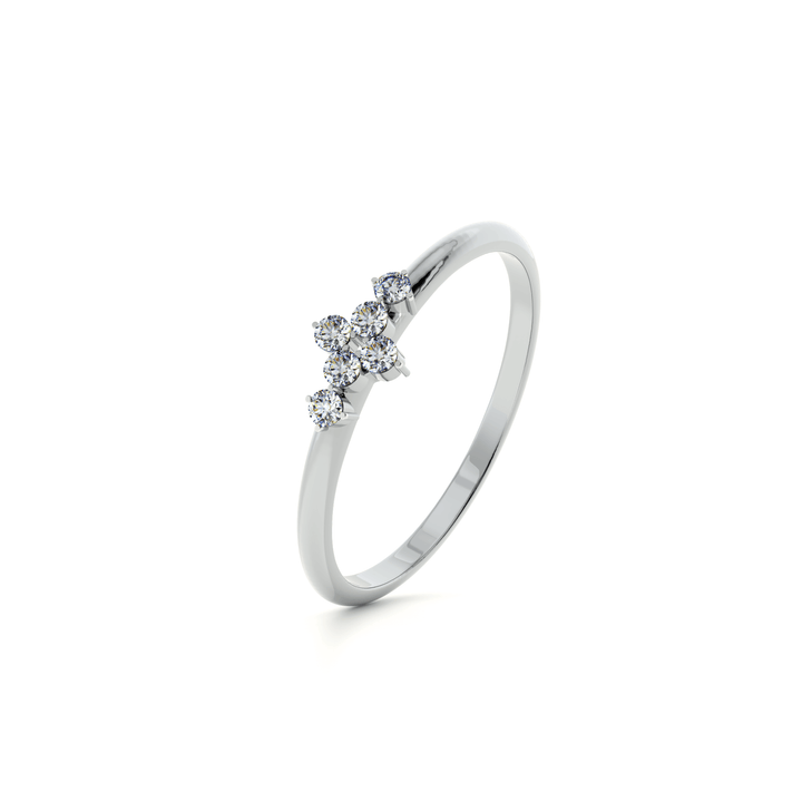 This delicate ring features a unique cluster of sparkling round-cut diamonds arranged in an elegant floral-inspired pattern. The minimalist band complements the intricate design, creating a refined balance of subtle glamour and timeless charm. Perfect for those seeking a sophisticated piece that stands out with understated brilliance and artistic craftsmanship.