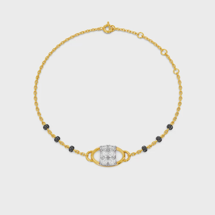 A striking mangalsutra pendant that blends modern geometry with timeless tradition. Designed with an oval silhouette and a central panel of shimmering polki-style stones, this piece is framed in a warm gold-toned finish that enhances its refined appeal. The sleek contours give it a contemporary edge while preserving classic elegance.