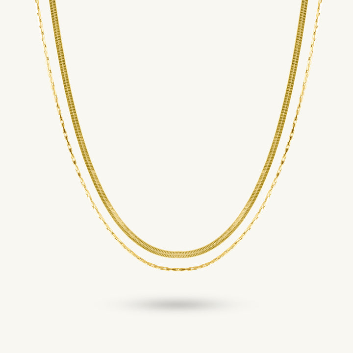 The Sleek Dual Chain Layered Necklace embodies contemporary elegance with two polished chains arranged in perfect symmetry. The layered design creates depth and dimension, enhancing its modern appeal while maintaining a refined balance. Each link is crafted with precision, offering a fluid movement that reflects light with radiant brilliance. Minimal yet bold, this necklace represents sophistication and timeless artistry, making it a striking expression of confidence and luxury.
