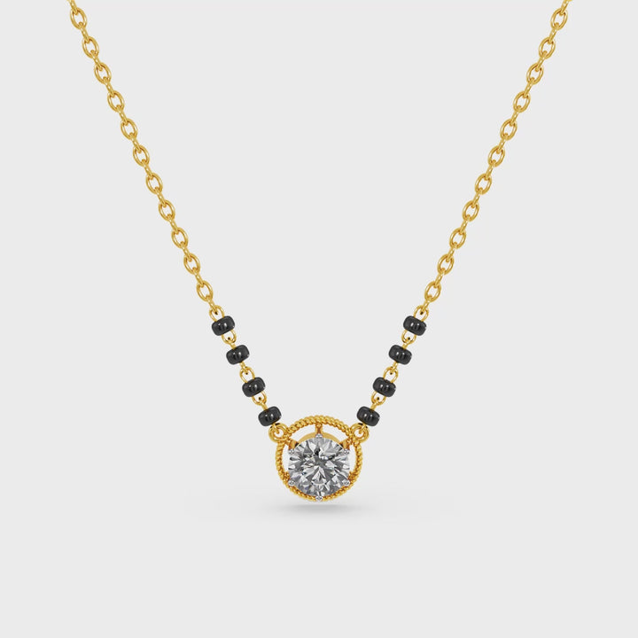 The Solitaire Antique Aura Lab Grown Diamond Mangalsutra features a radiant solitaire diamond encased in a finely crafted circular frame, symbolizing eternity, unity, and strength. The antique-inspired design blends timeless heritage with modern elegance, making it a meaningful representation of marital devotion. Each lab grown diamond is precision-cut to maximize brilliance, ensuring a luminous sparkle from every angle. A refined balance of tradition and artistry, this mangalsutra stands as an everlasting emblem of love and togetherness.