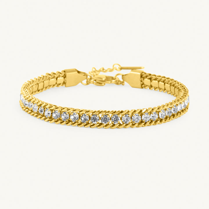 Light up your moments. Meticulously crafted from stainless steel and plated in radiant 18K gold, our Sparkle Row Tennis Bracelet is made for your kind of elegance. Its brilliant stones capture every glance. Pair it with crystal studs or a satin dress for that flawless, graceful finish.
