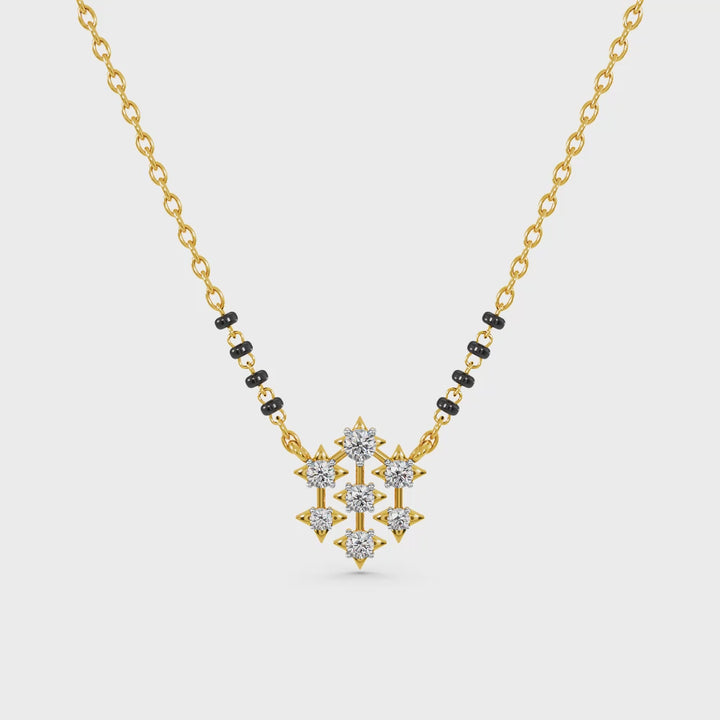 A beautifully detailed mangalsutra inspired by floral geometry, crafted with multiple polki-style stones arranged in an eye-catching pattern. Finished in a rich gold tone, this design adds graceful movement and traditional charm, making it ideal for festive occasions and special moments.