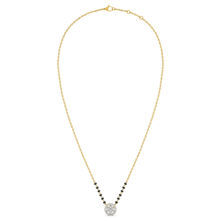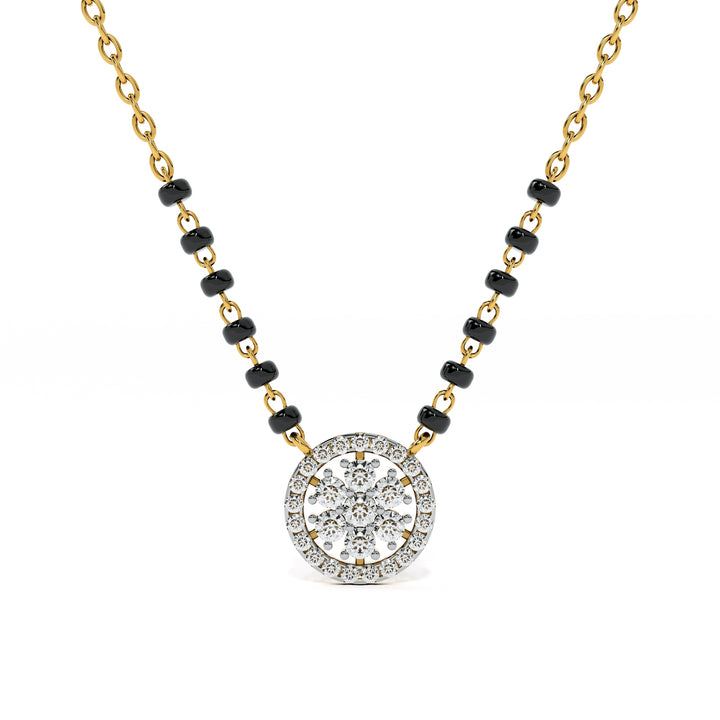 The Sunflare Halo Lab Grown Diamond Mangalsutra captures radiance with its circular halo design, encasing a central diamond that glows with brilliance. The halo symbolizes completeness, eternity, and protection, while the central stone reflects purity and strength. Each lab grown diamond is carefully set to maximize sparkle, creating a luminous sun-like glow. This mangalsutra is a perfect union of tradition and contemporary design, representing eternal love and marital devotion.