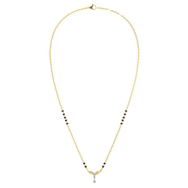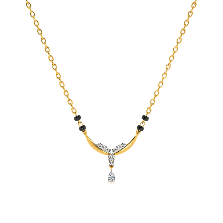 The Delicate DropLab Grown Diamond Mangalsutra features a refined drop pendant suspended from a sleek Y-shaped chain, symbolizing elegance, strength, and continuity. The centerpiece sparkles with diamonds, representing purity and brilliance, while the unique design adds sophistication to the traditional mangalsutra style. Crafted with precision, this piece blends modern aesthetics with symbolic depth, making it a radiant expression of marital love and sacred union.