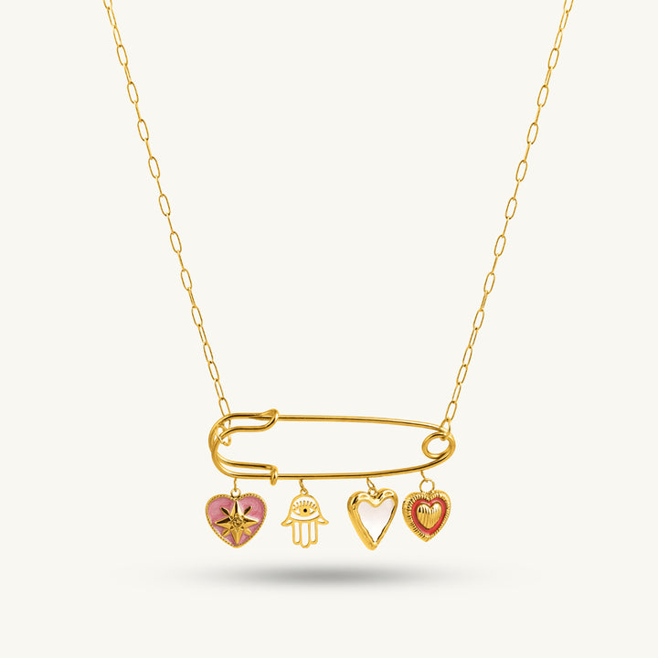 Pin your style, wear your story.Our Trendy Safety Pin Charm Necklace redefines edgy elegance with a touch of sentiment. Crafted from stainless steel and finished in radiant 18k gold plating, this necklace symbolizes strength and connection—made especially for you, to express your bold individuality. Waterproof, anti-tarnish, and timelessly chic, it’s the statement piece your wardrobe has been waiting for.