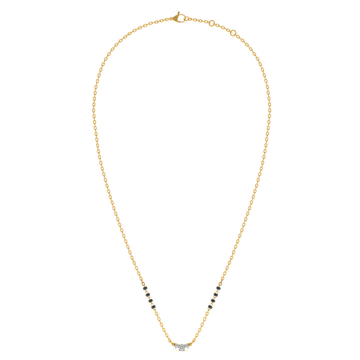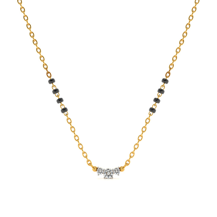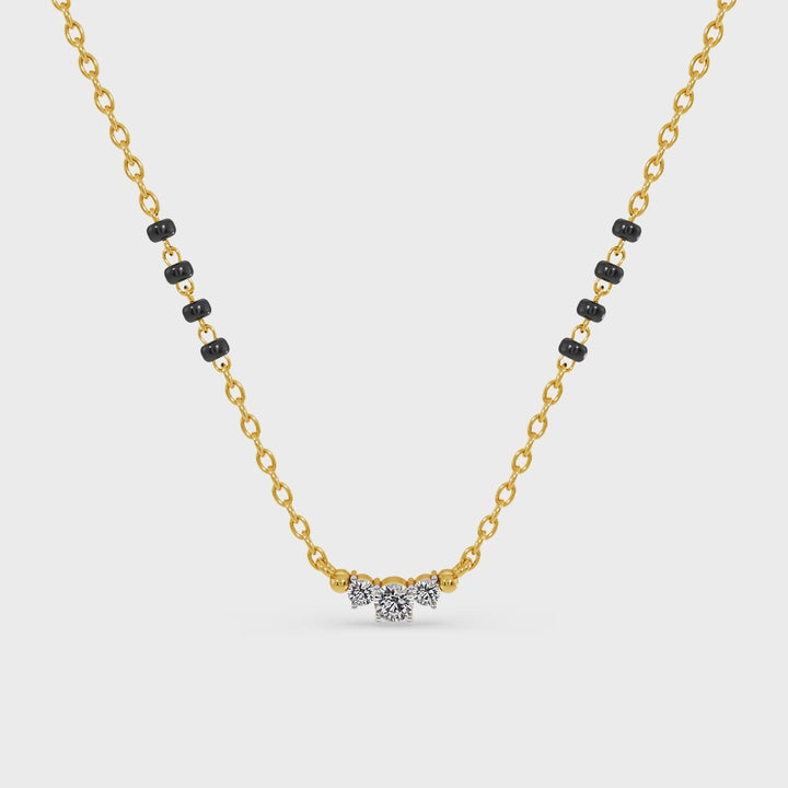 The Trinity Grace Lab Grown Diamond Mangalsutra celebrates harmony and balance with its trio of sparkling diamonds arranged in symmetry. Each stone represents past, present, and future, making it a meaningful emblem of everlasting love. Designed with precision, the diamonds radiate brilliance while maintaining a refined elegance. A piece that bridges traditional symbolism with modern craftsmanship, this mangalsutra shines as a timeless expression of marital unity and grace.