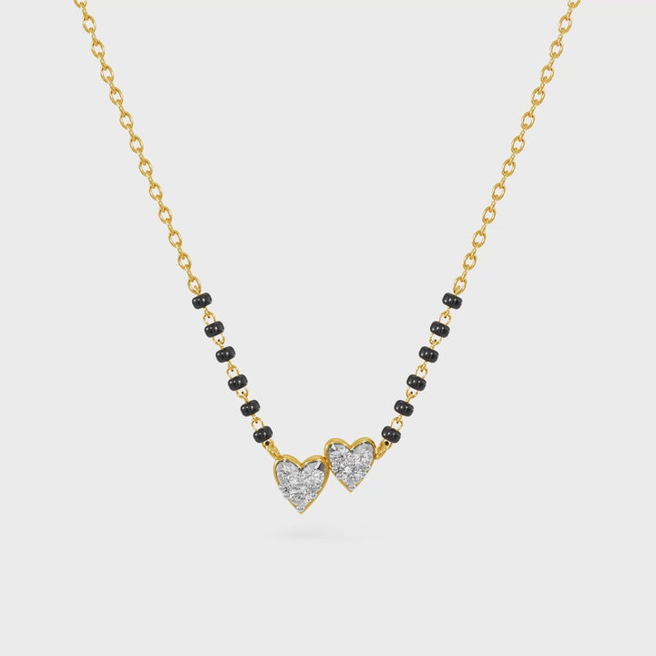 Celebrate love and tradition with this elegant heart-shaped mangalsutra pendant. Designed with two delicate hearts outlined in a warm gold-tone finish, the pendant features sparkling clear diamonds that add a subtle, graceful shine. Suspended on a classic black-beaded chain, it beautifully blends modern romance with timeless Indian craftsmanship.